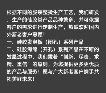 ????我公司生產(chǎn)的硅膠海綿具有耐高溫、耐壓、透氣性能好、抗撕拉、使用壽命長(zhǎng)、環(huán)保等特點(diǎn),主要適用于服裝干洗、水洗熨燙設(shè)備,如壓燙機(jī)和燙臺(tái)等。另外我們也提供各種燙氈、罩布等整燙專(zhuān)用墊料,客戶(hù)可根據(jù)不同熨燙工藝選擇不同的搭配組合,滿(mǎn)足高品質(zhì)的熨燙要求。
